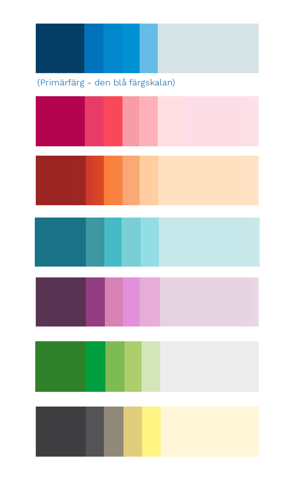 I Ronnebys färgskala har vi sedan länge utgått från den blå kulören i vårt vapen. Den primära färgen är blå, men paletten innehåller även andra färger för att många olika verksamheter ska kunna hitta sitt rätta uttryck. Ta gärna del av de exempel som återfinns här på vår profilwebb för att bilda dig en uppfattning om hur du bäst kombinerar våra färger.
